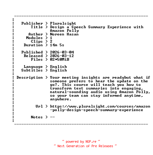Pluralsight.Design.a.Speech.Summary.Experience.with.Amazon.Polly.2026.BOOKWARE-GETH