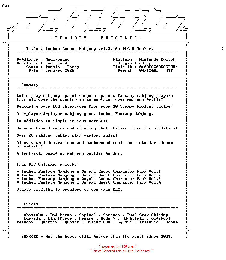 Titel: Touhou_Gensou_Mahjong_DLC_Unlocker_NSW-SUXXORS