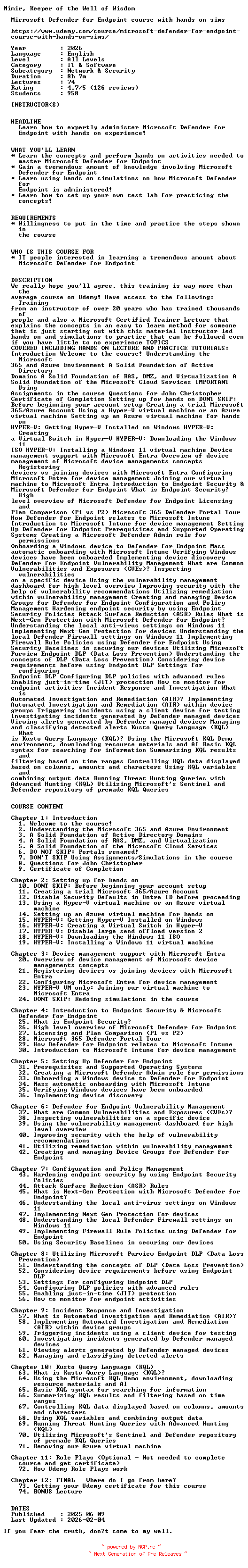 Titel: UDEMY Microsoft Defender for Endpoint course with hands on sims