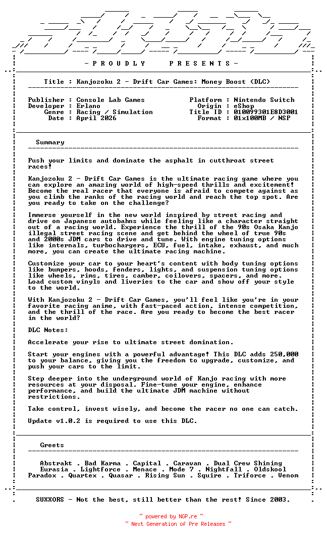 Titel: Kanjozoku_2_Drift_Car_Games_Money_Boost_DLC_NSW-SUXXORS