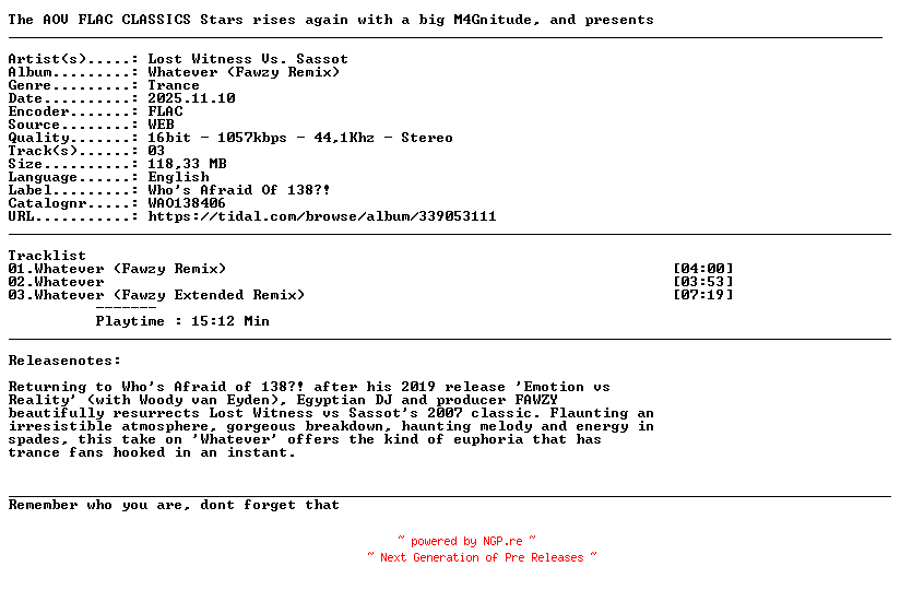 Titel: Lost_Witness_vs _Sassot-Whatever_(Fawzy_Remix)-(WAO138406)-16BIT-WEB-FLAC