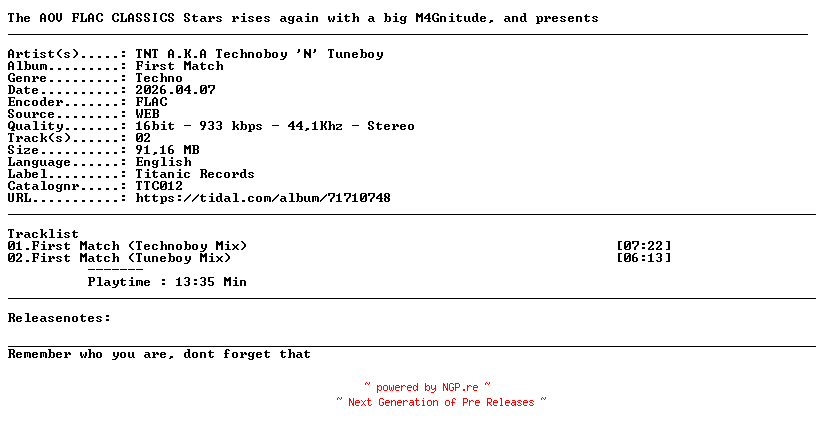 Titel: TNT_A K A_Technoboy_N_Tuneboy-First_Match-(TTC012)-16BIT-WEB-FLAC